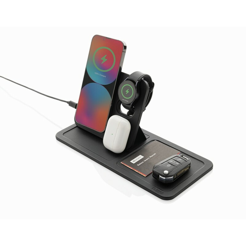 Ta wszechstronna ładowarka to idealne rozwiązanie dla wszystkich, którzy posiadają najnowocześniejsze technologie. Wyposażona w magnetyczną ładowarkę 15W dla telefonów, dodatkową ładowarkę 5W dla etui na słuchawki ou innych drobnych urządzeń oraz ładowarkę 2,5W, specjalnie zaprojektowaną dla smartwatchy, jak na przykład Apple Watch. Dzięki wbudowanemu kablowi TPE o długości 120 cm, uzyskasz łatwy dostęp do zasilania, gdziekolwiek jesteś.